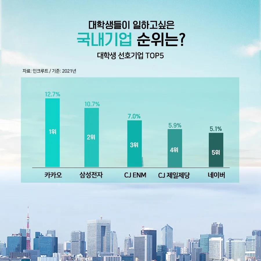 根据调查结果是Kakao。kakao以12.7%的得票率位居榜首,继去年,连续两年位居于此。一位选择Kakao的大学生说:“平台正在稳步发展。尽管最近出现了新冠疫情,但仍推进了各方面新事务,给我留下了深刻的印象。进入Kakao后,前途也会更加广阔,自己的成长可能性也会更高”。