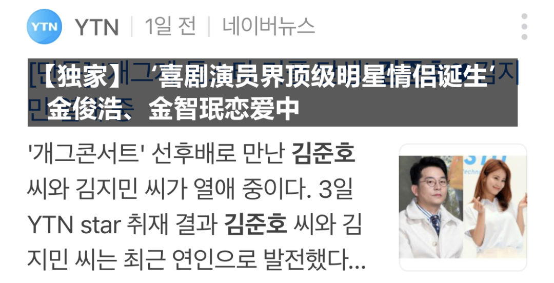 此前4月3日据韩媒YTN独家报道,喜剧演员界的顶级明星金俊浩、金智珉在最近发展为恋人关系。原本作为喜剧演员界前后辈相处的两人,最近开始真挚地交往。