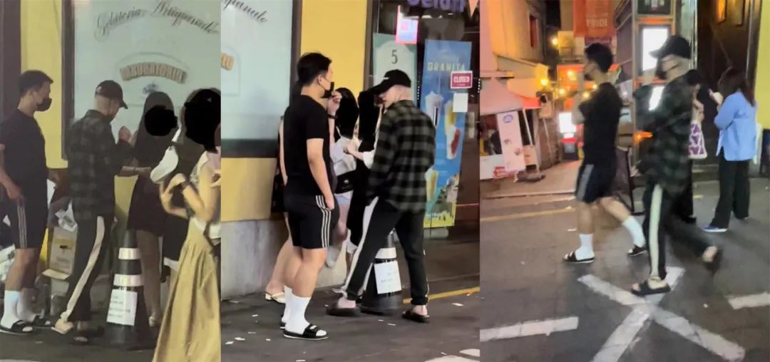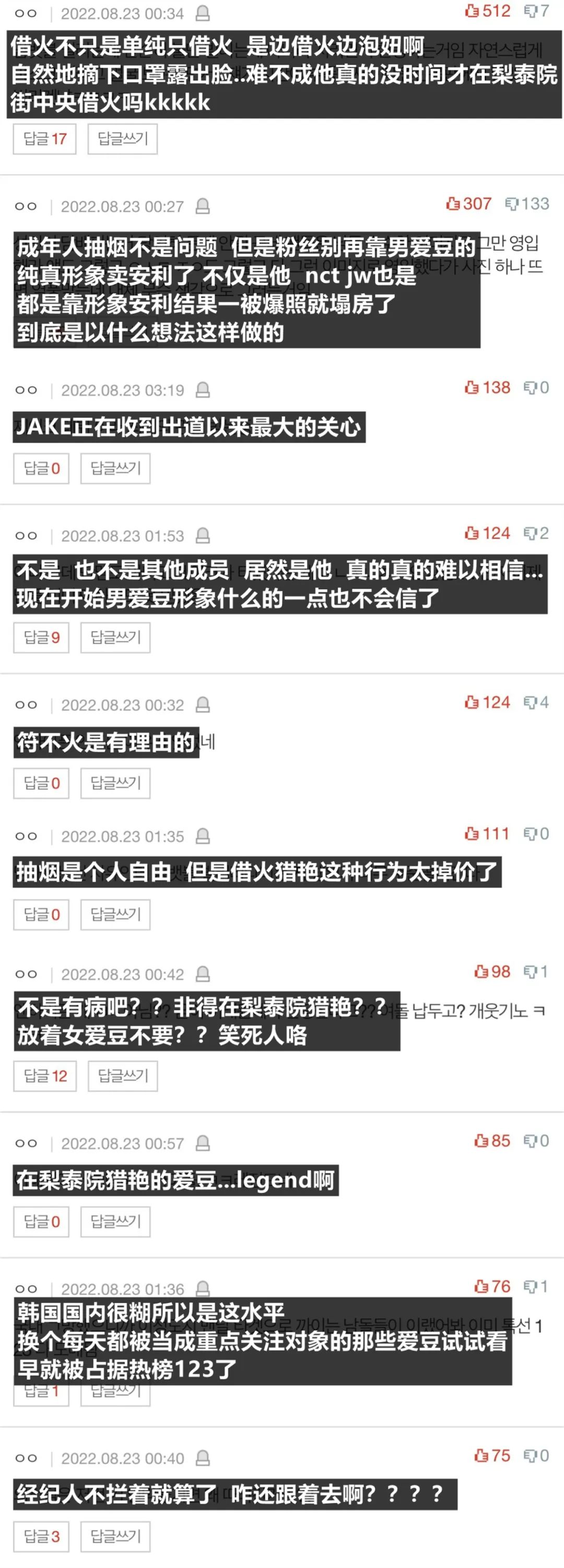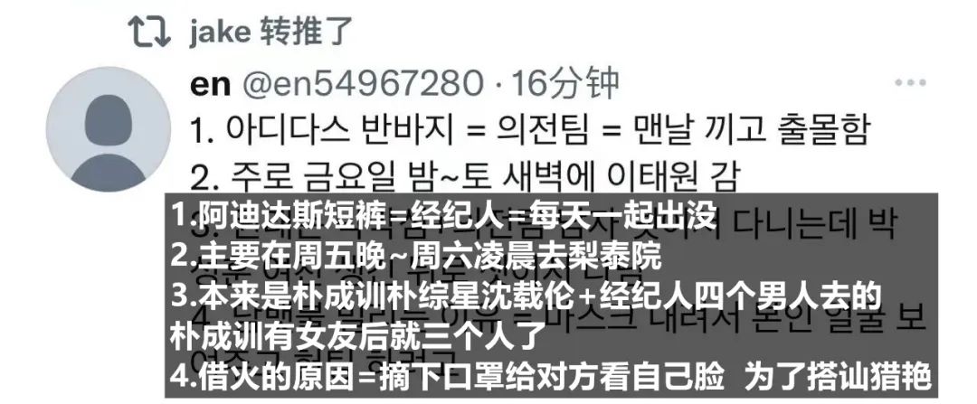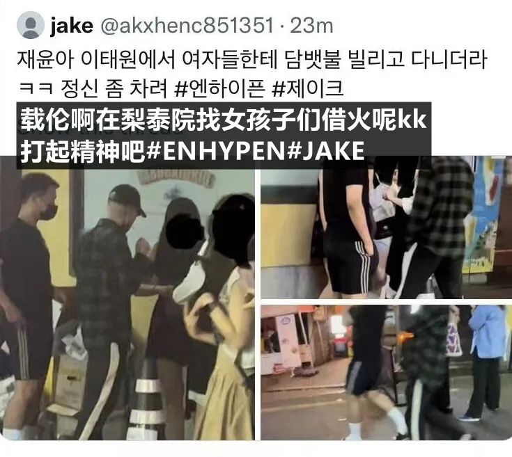 根据该帖中提到的爆料博主账号更新显示,爆料人今年6月在梨泰院附近目击到ENHYPEN成员JAKE(沈载伦)在向女性借火点烟,其拍摄的照片上被指认为JAKE的男子身穿格子衬衫,头戴鸭舌帽,靠近女生时将口罩摘下,身边跟着另一位男子。
