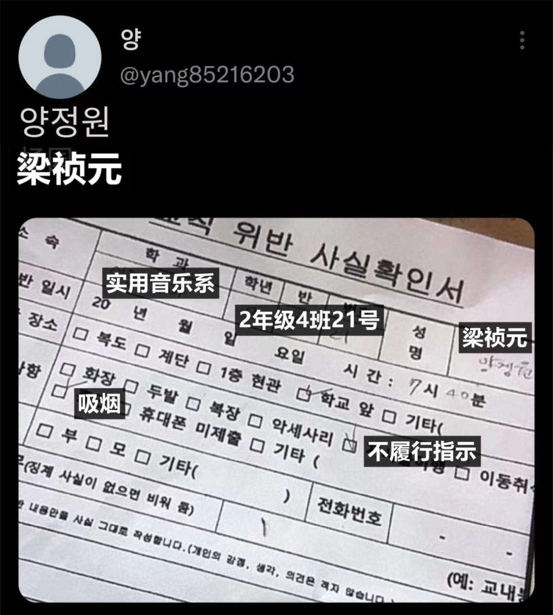 一时间粉丝们陷入了各种猜测之中,然而这时又有第三位爆料者带着新的爆料出现。该账号同样转发了第一位爆料者的动态,附上了ENHYPEN成员“梁祯元”三个字和一张疑似学校反省文格式的纸张,姓名栏上的“梁祯元”和违反校规事项栏中被勾选的“吸烟”“不履行指示”等关键字让粉丝们又一次陷入了混乱。