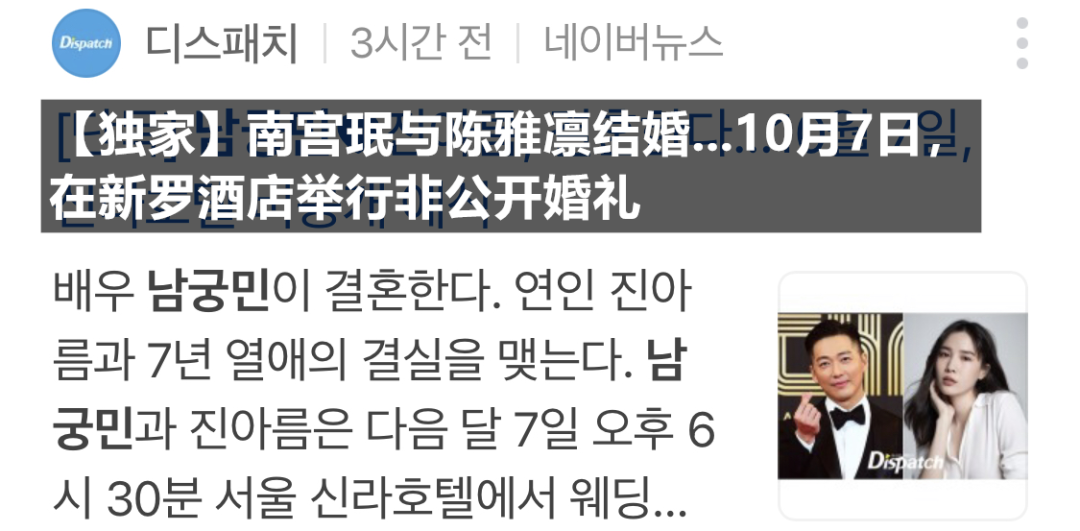 9月28日早上据韩媒Dispatch独家报道表示,演员南宫珉与女友陈雅凛将于10月7日在首尔新罗酒店举行婚礼。婚礼将只邀请两家亲戚和朋友,以非公开形式举行。随后南宫珉的所属社也发文官宣了南宫珉即将结婚的事实。