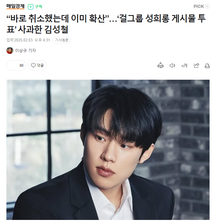 引发争议后,金圣喆通过所属经纪公司Story J Company上传了道歉公告:“确实是我做错了,对于相关争议我无话可说,只是感到抱歉”、“我完全不知道那是有争议的账号,知道后立刻取消了投票,但是相关截图已经传开了”、“因为是涉及到其他艺人的内容,好像给她们带来了损失和伤害,真的非常抱歉”、“今后我会更加慎重,不会再发生类似的事情”。