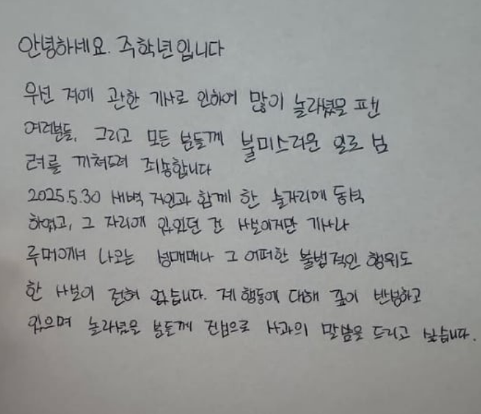 对此,韩国网友嘲讽道:“谁会相信这个呢”、“没有的话为什么要退团,当大家是傻瓜吗”、“看来和《周刊文春》达成协议了啊”、“笑死了,难道手写道歉信是免罪符吗?因为是手写所以要相信吗”、“看这个换行道歉文应该是别人构思的,他只是用手抄在了纸上,太没诚意了”、“那MC梦也被开除了是怎么回事”……