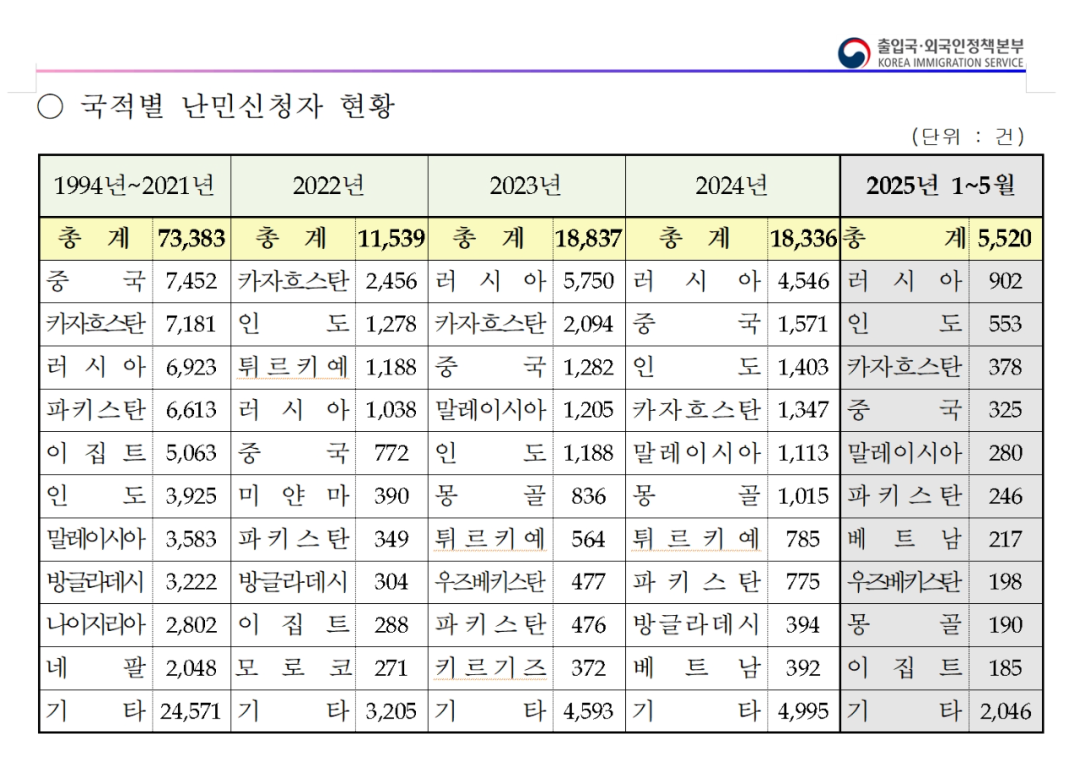 据韩国法务部公布的数据,2024年共有1571名中国人向韩国政府申请了难民身份,而在2025年1月至5月,已有325人提交了类似申请。虽然近年来因韩国政府加强打击力度,虚假难民申请的人数有所下降,但依然有不少人仍在尝试。究其原因,是因为许多中国人在不懂韩国签证制度和法律规定的情况下,被一些非法中介欺骗,误以为申请难民就能获得“合法长期签证”,从而留在韩国工作。