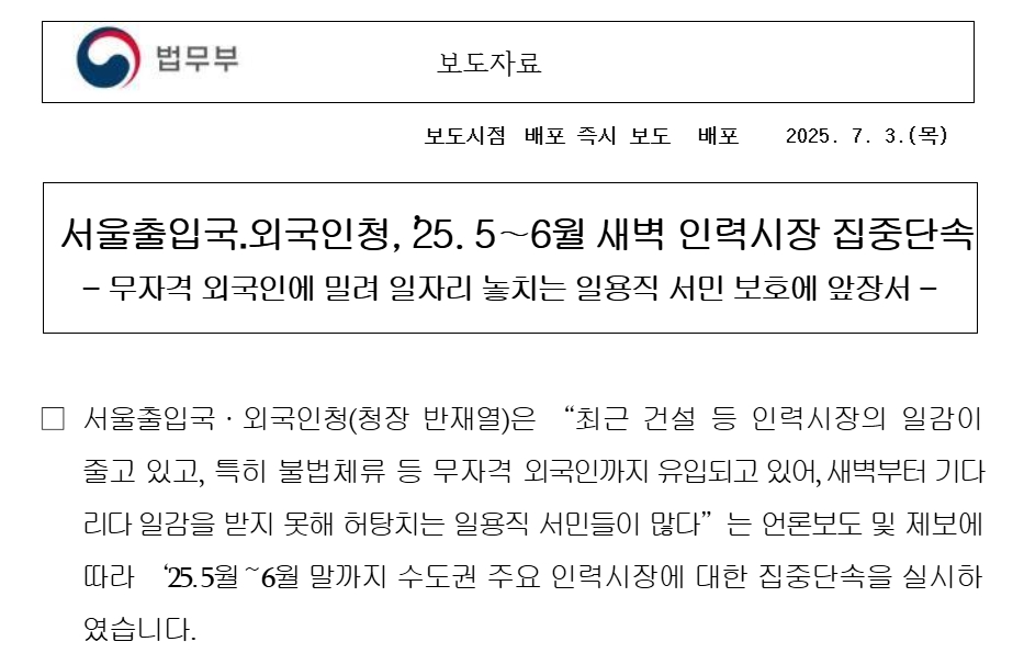 近年来,不少中国人在韩国非法滞留或从事非法打工,并且普遍存在一个错误认知:他们认为韩国政府对人力市场的管理较为宽松,只要低调一点,就不会被查处。然而这种想法是非常危险的。事实上,韩国法务部近几个月加强了对非法劳动力市场的整顿,特别是5月和6月,首尔出入国外国人厅在多个热点地区展开了大规模的突击检查,显示出政府维护本国劳动力市场秩序的强烈意志。