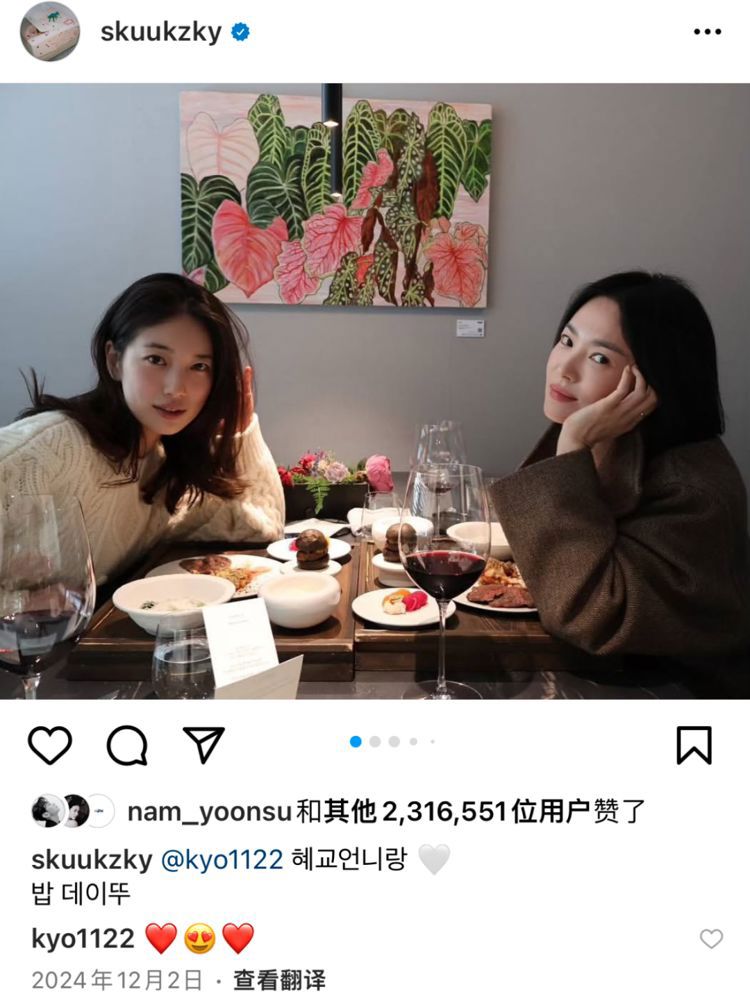 后来宋慧乔生日时秀智又请了宋慧乔吃饭,两人再次上传了约会合照。秀智:和慧乔欧尼的吃饭约会。宋慧乔:漂亮的妹妹请我吃生日饭的那天,照片也拍得很棒!看美女同框真的很享受,两位请多多约会吧!