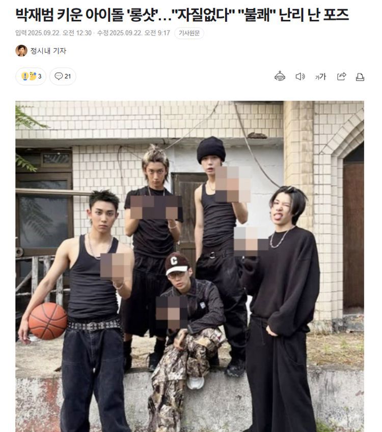 照片中包括朴宰范在内的五人集体对着镜头竖起中指,对此韩国网友纷纷指责道:“第一次亮相就做这种手势吗”、“确定是偶像男团吗”、“为什么用手指辱骂初次见面的我”、“连基本职业素养都不具备”、“这一点也不符合HIPHOP文化真正的酷精神”、“我只是老实待着,就被不认识的人骂了”、“自以为帅气,其实就是没素质”、“不用出道,没有这种需求”、“中二病犯了吧”……