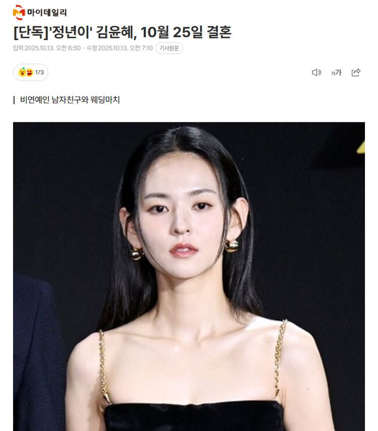 据韩国媒体报道,金允慧将于本月25日在首尔某处举行婚礼。未婚夫是圈外人,两人因认定彼此是命中注定的伴侣而约定结为连理。婚礼将只邀请双方亲友,以非公开形式举行。