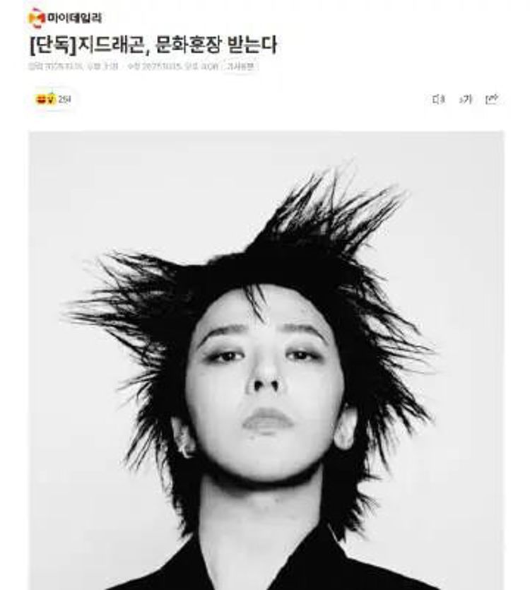 据韩国媒体报道,权志龙将在23日于首尔国立剧场海鸥剧场举行的第16届“韩国大众文化艺术奖”颁奖礼上被授予文化勋章。