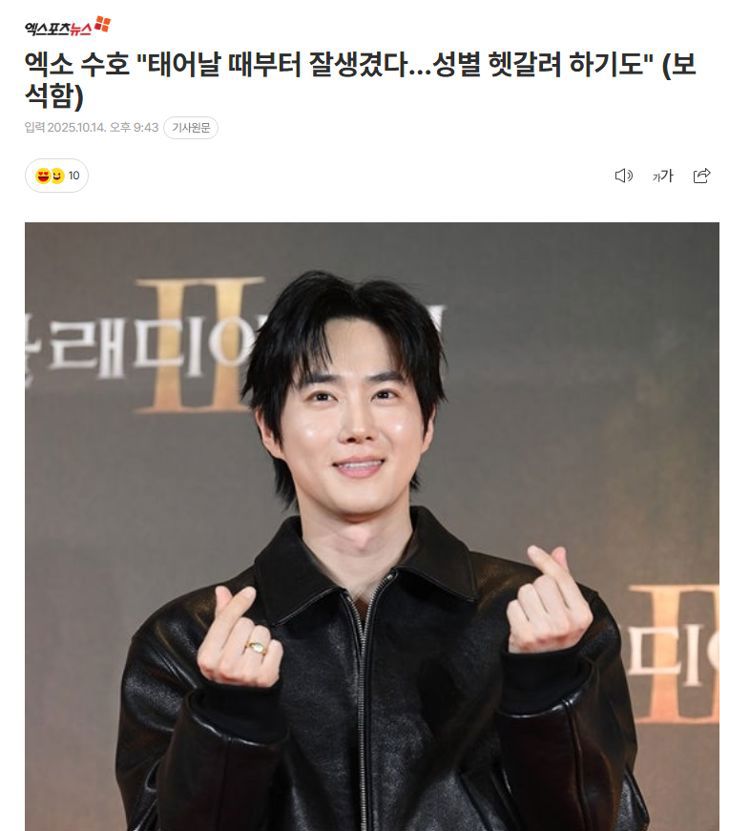 在本月14日公开的YouTube节目“洪锡天的宝石盒”中,SUHO大方展现出对自己外貌的自信。当洪锡天提问“从什么时候开始这么帅的?感觉从小就是美男”时,SUHO毫不犹豫地自信回答:“是的,从出生开始就是。”