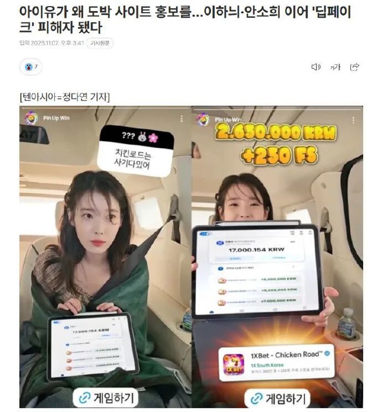 在该视频中,AI合成的IU说道:“说'Chicken Road是骗局,在这里根本赚不到钱',这类评论现在真是受够了”、“就在我刚才说话这会儿,1700万韩元就这么掉下来了”、“看吧,是真的。连我自己都难以置信”,以此介绍通过该游戏可以赚取巨额资金。