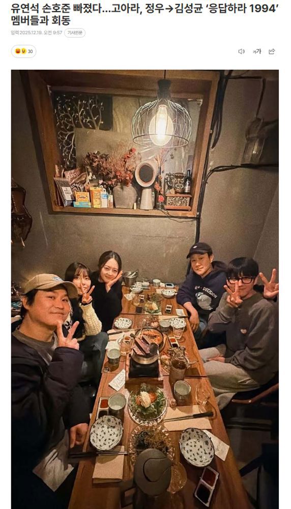 本月19日,韩国演员高雅拉在个人社交媒体上分享了一组合影,照片中她与郑宇、金成均、车善玗、敏度希等《请回答1994》主要演员齐聚一堂,众人围坐一桌,笑容自然,氛围轻松,仿佛时光从未流逝。