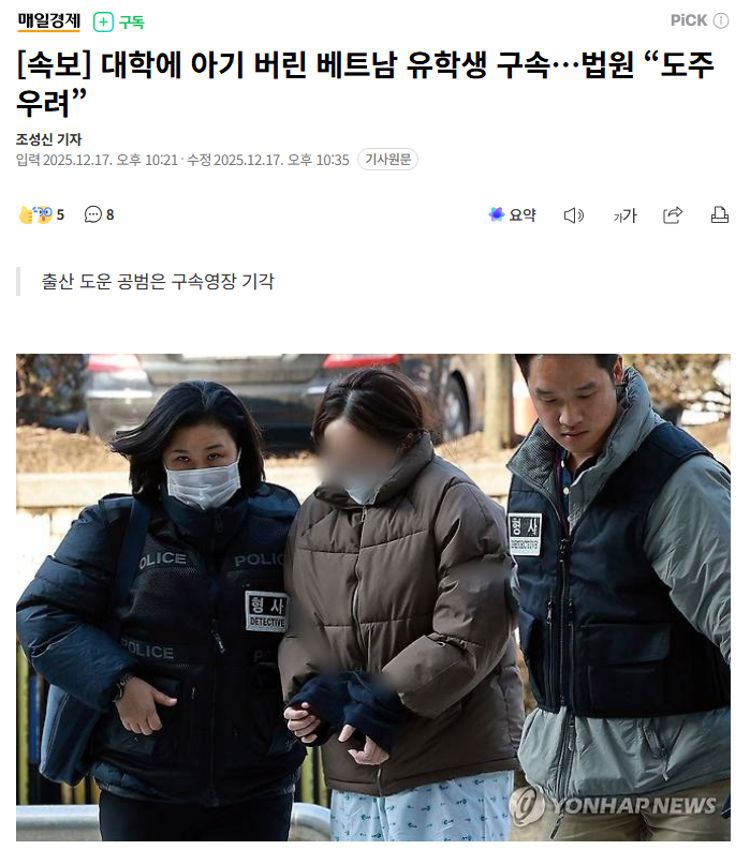 首尔中央地方法院17日决定,对涉嫌违反《儿童虐待处罚法》(儿童虐待致死罪)的20多岁越南籍产妇A某签发逮捕令,理由是“存在逃亡风险”。而同样被申请的从犯B某,则因“难以认定充分的拘留理由”而未被批捕。