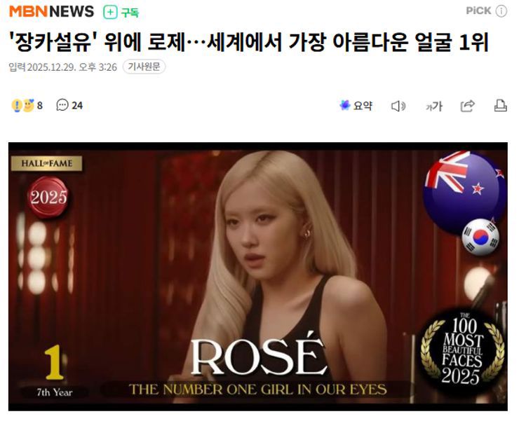 当地时间28日,在美国电影网站TC Candler评选的“世界最美面孔100”女性部门中,ROSÉ获得第1名,aespa成员KARINA位列第8名,BLACKPINK成员智秀位列第11名。