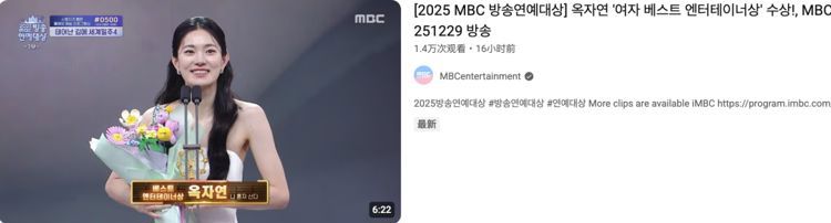 12月29日2025年MBC演艺大赏圆满落幕,然而有一位韩国女演员因为发表获奖感言时间过长引起了热议,她就是玉子妍。玉子妍出生于1988年,她于2012年凭借舞台剧《客人》踏入演艺圈,近几年在众多电影和电视剧中亮相,凭借《惊奇的传闻》、《我的》、《黑话律师》、《王后伞下》、《好久没做》等作品给观众留下了更加深刻的印象。今年她还凭借出演《我独自生活》获得了2025MBC演艺大赏最佳艺人奖。然而在发表获奖感言时,玉子妍一个人就发表了约5分20秒的获奖感言,虽然制作组中途要求过她结束获奖感言,但她依然无视要求继续发言。