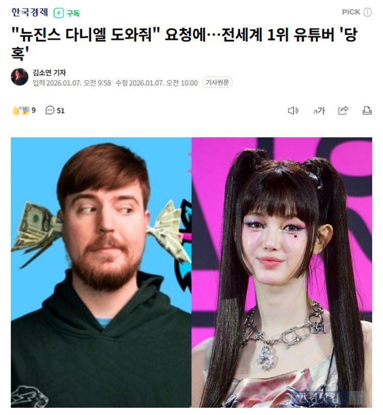 在过去一周里,NewJeans部分粉丝在MrBeast的Instagram、TikTok等社交平台留言,恳求“请收购HYBE”、“请拯救NewJeans”、“请帮助Danielle”、“请带走Danielle”等。网络上也扩散起了“#mrbeastsavenewjeans”这一话题标签。