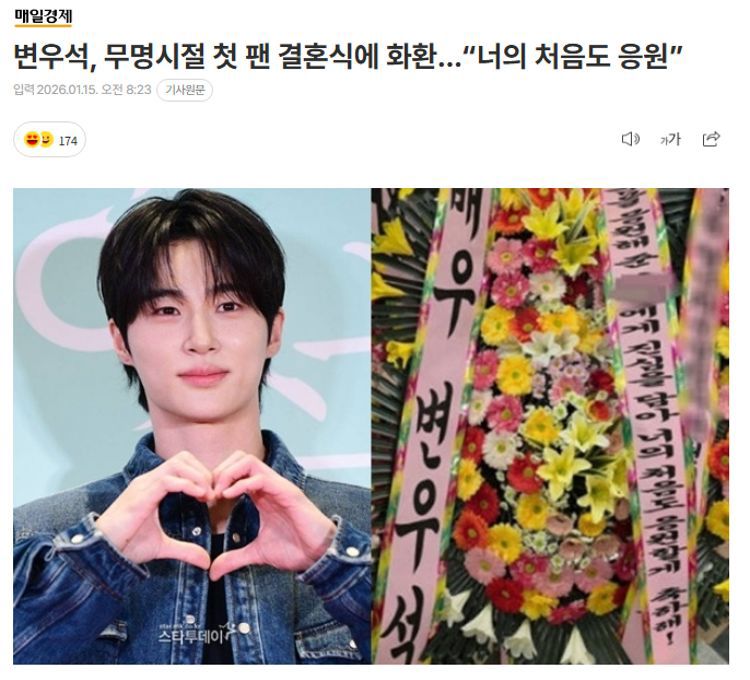 韩国人气演员边佑锡近日因给无名时期的“首位粉丝”送上婚礼花篮而成为话题。