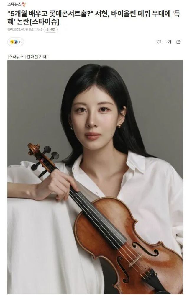 近日,韩国媒体报道称韩国女子组合少女时代出身演员徐贤在学习小提琴5个月后将登上乐天音乐厅舞台,引发了韩国网友质疑。