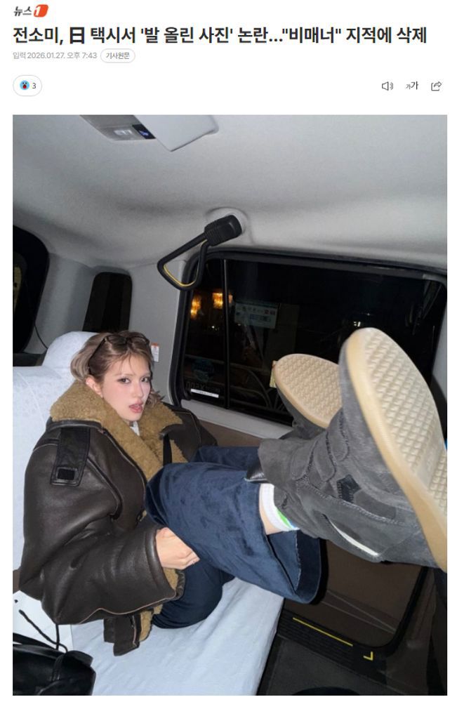 照片公开后,不少韩国网友批评全昭弥为追求潮流感而忽略了基本礼节:“没家教”、“作为具有国际影响力的艺人,更应尊重当地文化”、“出租车属于司机与乘客共用的营业场所,并非私人空间,遵守公共礼仪是基本要求”、“这样的行为即使在韩国国内也不恰当”、“她怎么每隔一段时间就要做出些没脑子的事”……