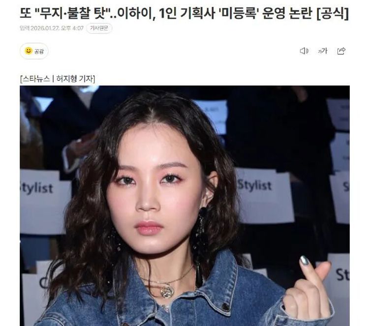 据报道,李遐怡的个人经纪公司已于本月21日在所属管辖的麻浦区政府完成了大众文化艺术策划业务的注册。文化体育观光部为了整顿行业内普遍存在的无证经纪公司问题,将去年年底之前定为"集中注册指导期"。但有消息称,李遐怡的公司是在该期限结束三周后才办理了注册手续。