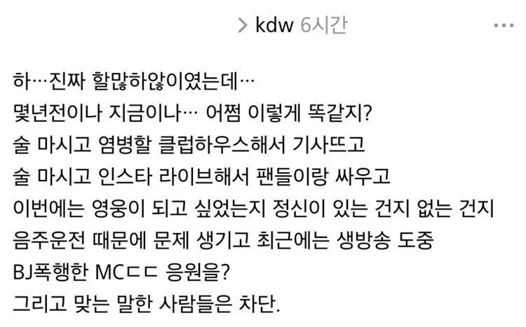 该网友称:“真是有太多话想说却不想说。无论几年前还是现在,你怎么就一点都没有改变呢?喝酒后玩Clubhouse上了新闻,喝酒后开直播和粉丝吵架。不知道这次是又想当英雄还是神志不清了,竟然还为酒驾出问题并且最近在直播中殴打网红的主持人应援。”