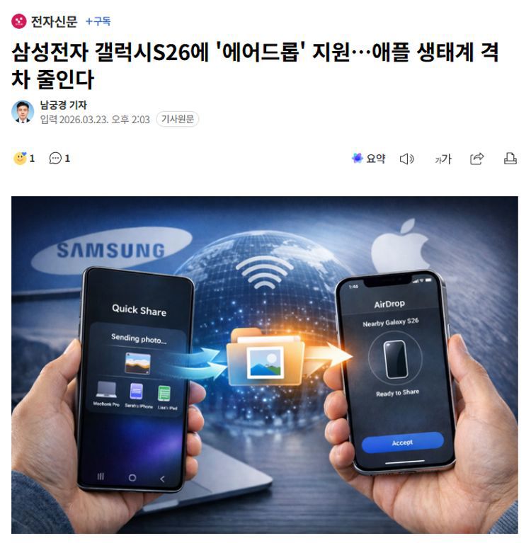 三星电子将以Galaxy S26系列为起点,实现与苹果文件共享功能AirDrop的联动。今后,Galaxy用户可以通过三星的Quick Share,与iPhone、iPad、Mac等苹果设备之间自由传输照片、视频、文档等文件。