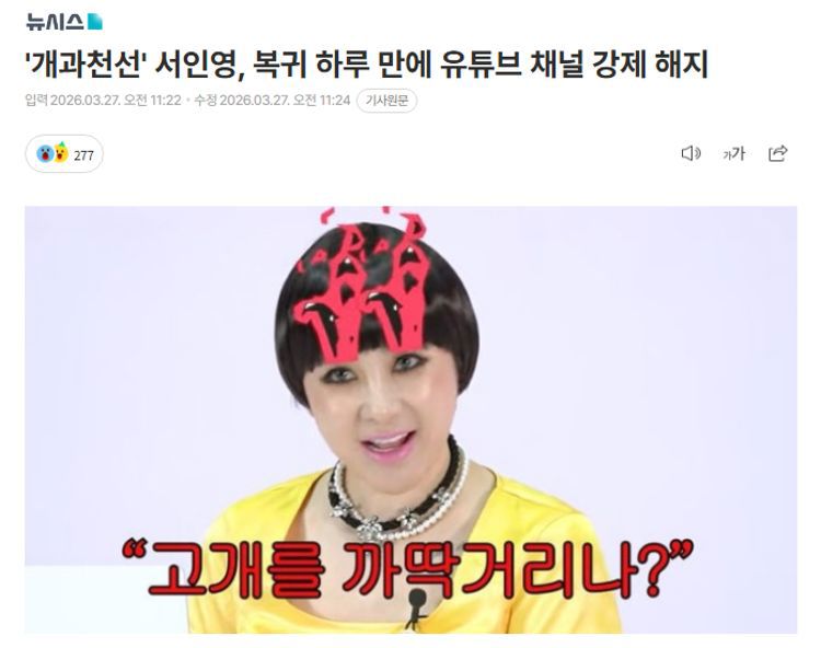 韩国歌手兼演员徐仁英(徐寅永)时隔10年、信心满满地筹备通过YouTube复出,谁承想仅一天便宣告中断。