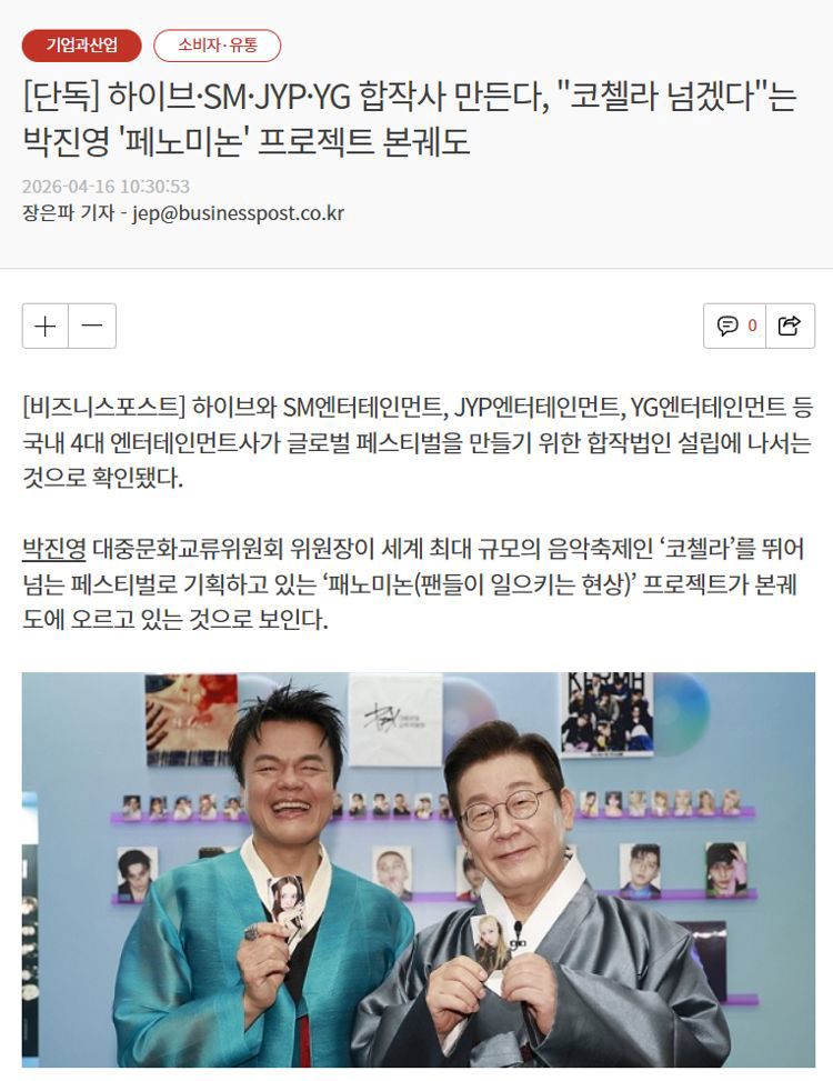 该合资公司计划由四大娱乐公司以同等持股比例出资,但代表理事构成、理事会结构等具体治理结构尚未确定。法人名称很可能定为“Fannomenon”,正如其名,该公司将作为执行朴轸永所推进的全球K-pop音乐节项目的核心平台。
