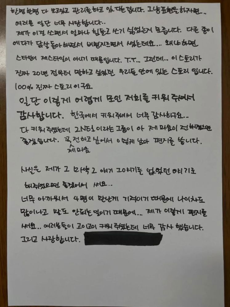 其实我写下这些的目的是希望大家把之前那个吸毒的事当成从未发生过。因为太可惜了,我们四个人的相遇是奇迹,年龄差也很大,那件事太荒唐了……所以我写下了这封信。感谢大家珍惜我们、把我们养大,非常感谢,爱你们。