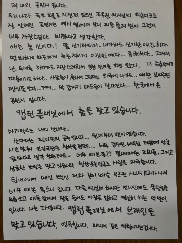 时隔一个多月,朴春再次以“致各位国民”为开头写下手写信,这一次她没有爆料任何事,而是表达了对2NE1这个组合和2NE1成员们的深厚感情。