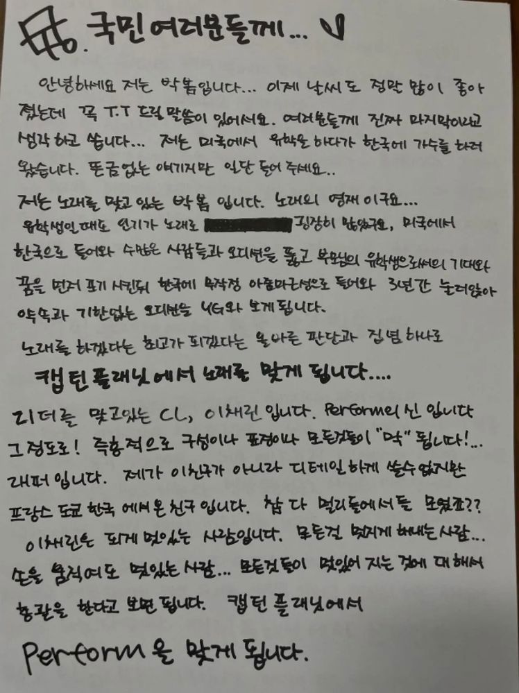 大家好,我是朴春。现在天气变好了很多,我有话一定要说。我是抱着这真的是最后一次给各位写信的想法写的……我曾在美国留学,然后为了做歌手来到了韩国。说起这个虽然很突兀,但请先听我说……