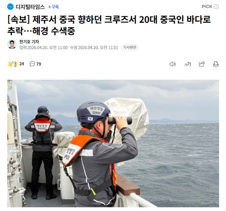 当地时间20日凌晨,一名20多岁的中国籍男性从一艘济州岛出发驶往中国的大型邮轮上坠海,韩国海警在接获报告后已紧急展开搜索。
